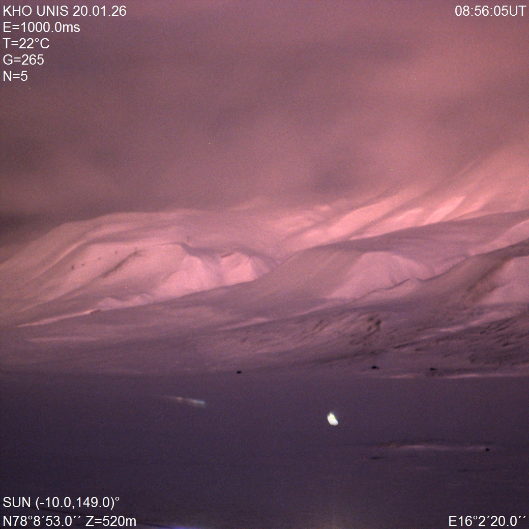 We suspect unusually cold conditions in the Stratosphere, leading to the formation of ice clouds. Even under nautical twilight - when the Sun is 10 degrees below the horizon - these clouds duct sunlight towards us. This phenomenon appears in our camera systems as reddish illumination on the surrounding mountain slopes. The image referenced here is taken from KHO toward Hiorthamn. The effect is explained in our Red-Sky Enigma paper published back in 2005.