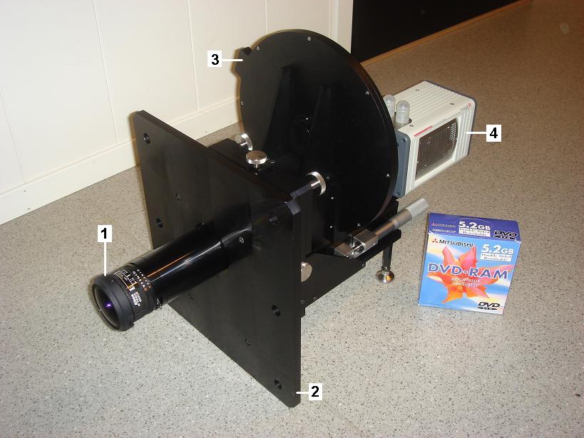The UEC all-sky airglow camera. (1) Nikon all-sky front optics, (2) mount plate, (3) filter wheel, and (4) EMCCD detector.
